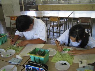 | 手品を習っています。うまくできたかな? | 「押し花」を色どりよく並べて、ウェルカムボードを作りました。 | 父の日にむけて、お父さんに絵手紙をかきました。描いているのはピーマンです。 |