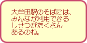 ○大牟田駅は、西鉄とJRの電車が、りょうほうとまります。 おみやげやさんがあります。 駅のちかくには、市内にすむ人たちが利用するいろいろなしせつがあります。