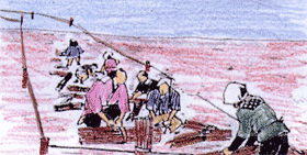 むかし(江戸時代)の干拓は、藩の計画で行なうものと、農民をまとめる庄屋などが中心になって藩のゆるしを受けて行なうものとがありました。干拓の中でもっとも大切で苦労した仕事が、海の水をせきとめるていぼうづくりでした。