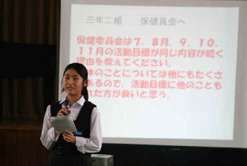 学級を代表して質問する生徒と、それに答える生徒会執行部が向かいあっての質疑応答がありました。